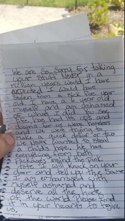 ▼信中的內容大概是:「很抱歉我們拿走了你的東西,我們從來沒有想過要拿走一個身體不舒服的5歲孩童的禮物,我對我這樣的行為感到非常羞恥。」順利拿回腰帶的莫雷拉,也被她們的誠意所感動,決定不再追究這件事。