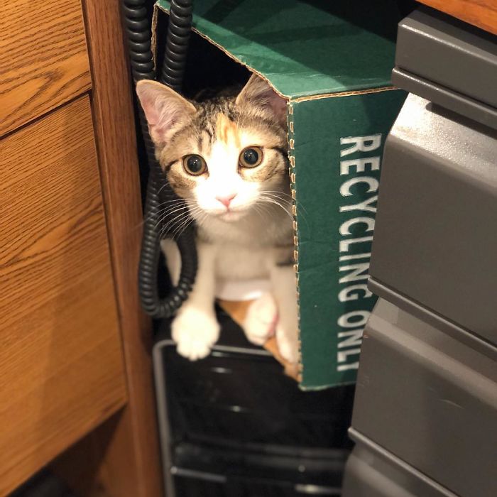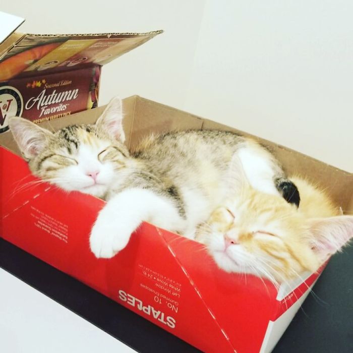 ▼牠們會跳到辦公桌上監督同事工作,還會鑽進沒來得及扔掉的紙盒,玩得不亦樂乎。