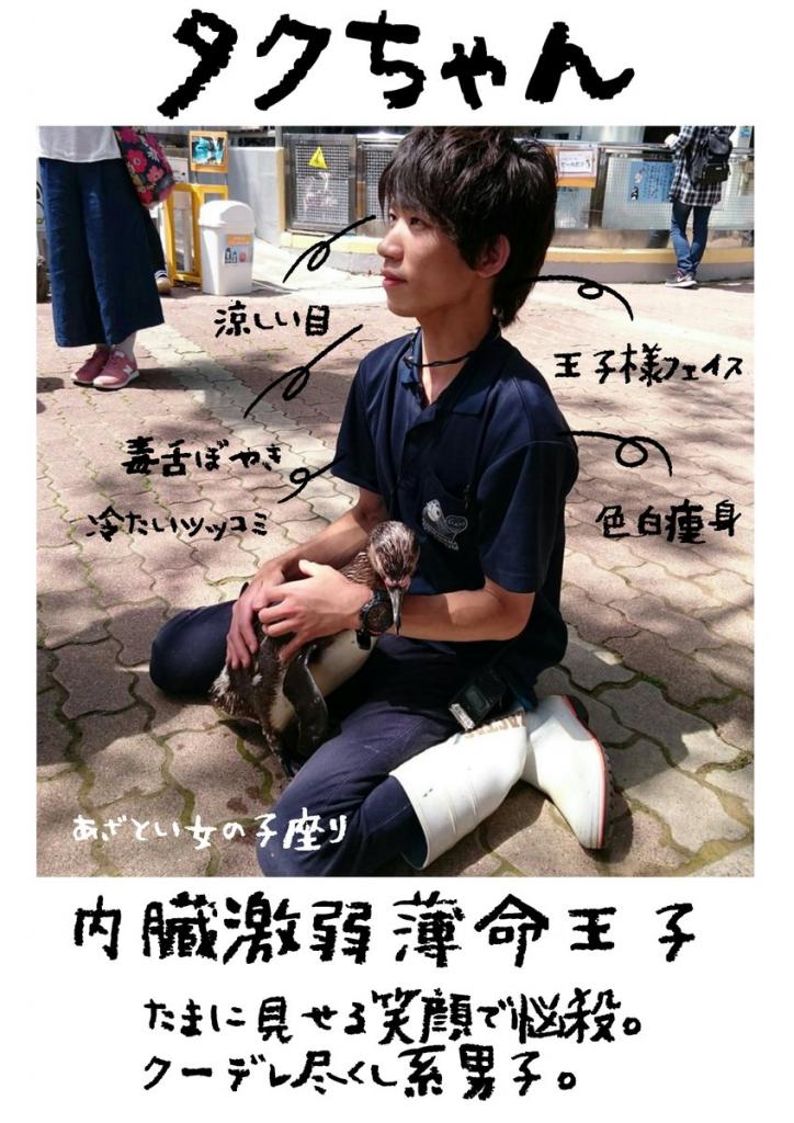 ▼桂濱水族館經常在推特上分享飼養員的日常,這名帥哥飼養員也被找了出來。原來他是魚類組的組長Taku(タク)。根據推特上的形容,他雖然有王子面孔,但非常毒舌,想搭訕的女生要三思啊。