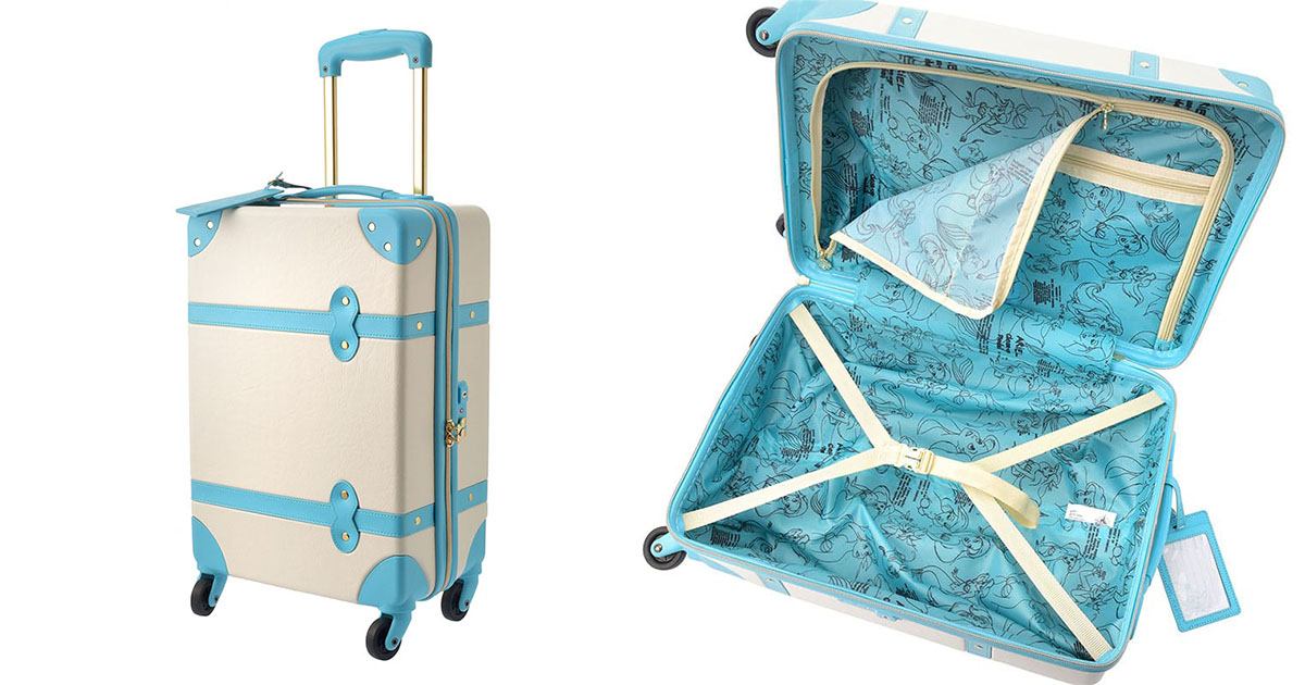 ▼就是這款行李箱!簡約風水藍純白外皮、超有質感的金色金屬釦與拉鍊,再搭上內襯滿滿的愛麗兒插畫,少女們根本難以抗拒!