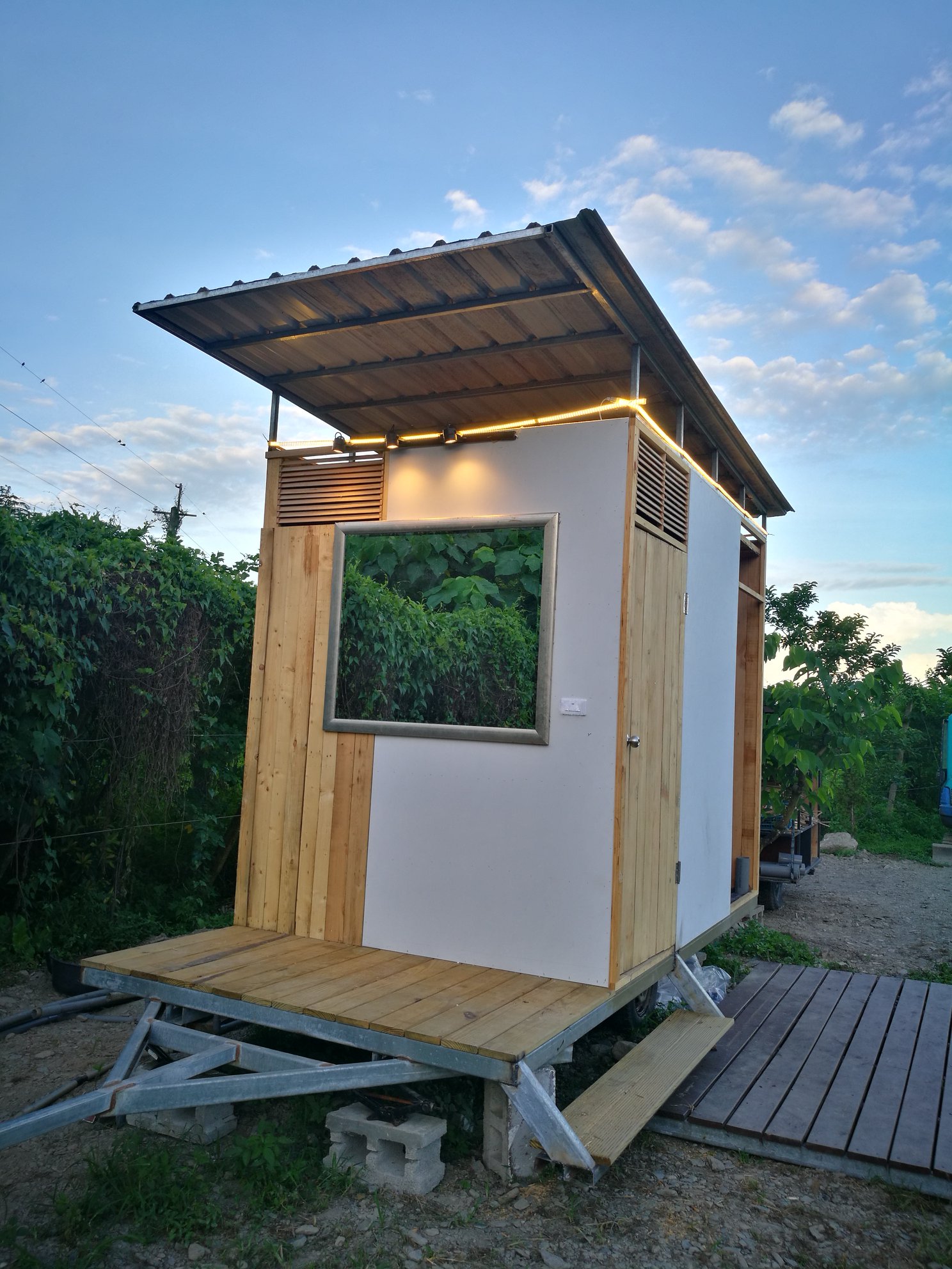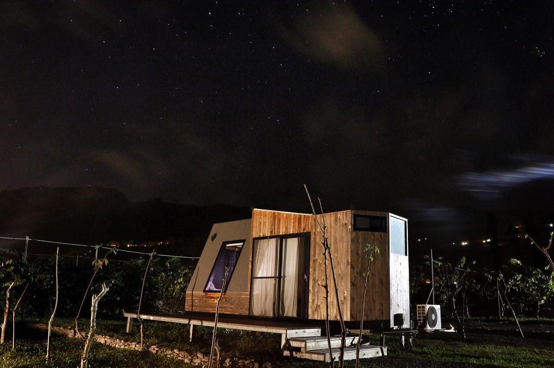 ▼原本這塊露營區只是一片荒地,經過老闆和天晴民宿老闆一起努力整治後,目前已有兩座Tiny House露營車以及五座火金姑帳篷,其中露營車「潑猴二號」是老闆花費一個多月的結晶,從鋼構骨架、原木壁板、衛浴,到水電、裝潢、傢俱等等,所有一切都是老闆親自建造出來的。