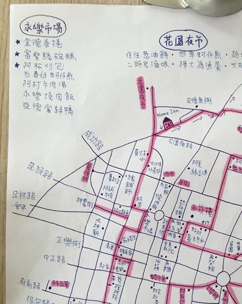 ▼從這張地圖可以看到,作者將整個台南市區都畫成了線狀圖,不僅列出了各地的美食位置,還將重點地方用粉紅色的螢光筆註記了起來。還畫有「永樂市場」、「花園夜市」、「保安路」的重點美食,例如永樂市場就要去吃金德春捲、富盛號碗糕,保安路則有阿明豬心、醇涎坊意麵等等。