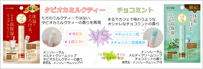 ▼日本化妝品公司 Mentholatum(メルティクリームリップ)宣佈,旗下的唇膏系列 Melty Cream Lip(メルティクリームリップ)將會推出兩款限時銷售的新口味唇膏,分別是珍奶口味以及薄荷巧克力口味!