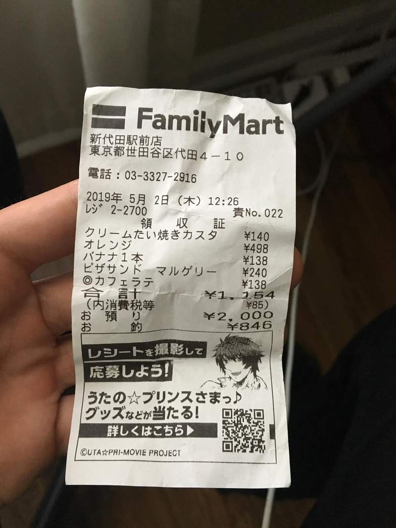 ▼今年Vasudeva在日本東京、名古屋和京都舉辦了3場巡演。5月2日巡演結束後,他們到京東世田谷區的全家便利商店,買了瑪格莉特比薩麵包、香蕉、橘子、拿鐵、還有奶油鯛魚燒,也拿到了這張收據。