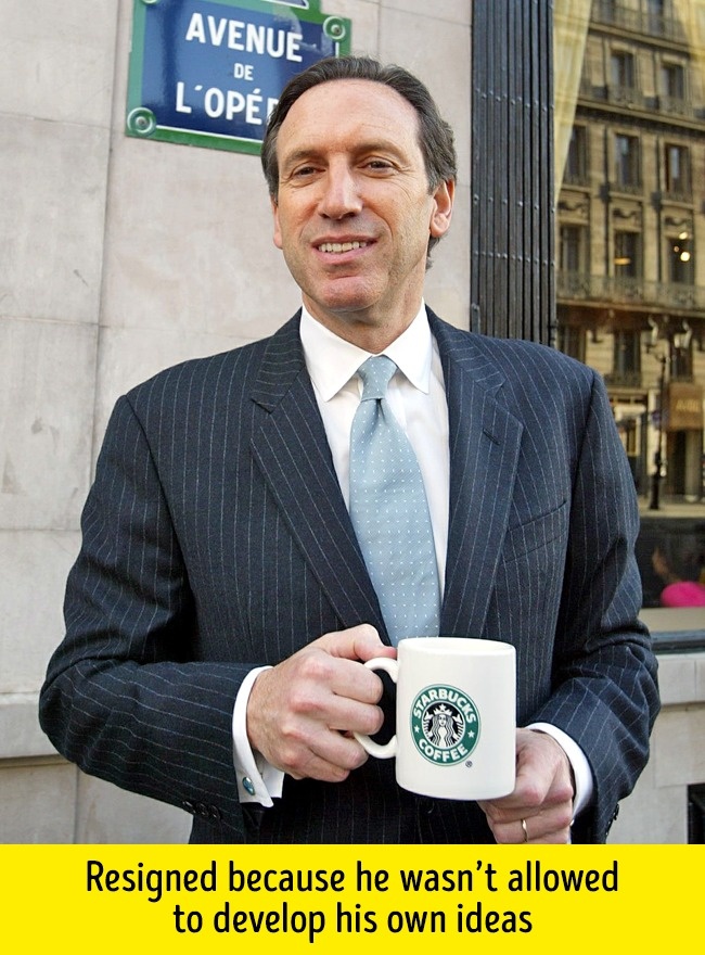 ▼霍華德舒爾茨(Howard Schultz)-無法實現自己的想法而離職:他本來在星巴克工作,那時星巴克只賣咖啡豆。霍華德提出了開連鎖咖啡廳的想法,卻被管理階層否決。他想將優質的咖啡和舒適的氣氛結合起來,提升顧客的回流率。2年後他收購星巴克,並把這一品牌打造成了全球知名的品牌。