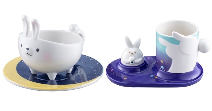 ▼另外的「玉兔踏月杯盤組」則是直接把月兔做成杯型,腳踩璀璨的夜空。「穿梭夢境馬克杯組」手柄則是月兔的尾巴,旁邊還有一隻迷你小月兔呢~