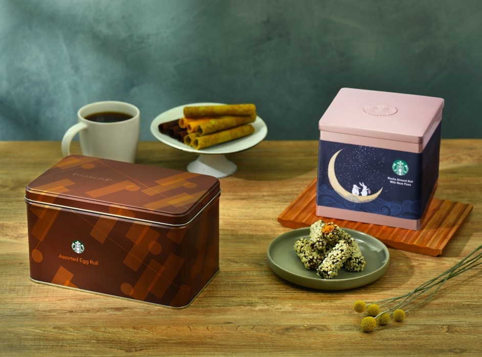 ▼禮盒部分,星巴克也推出限定「月光寶盒」,結合中西方特色,裡面有義式松露牛肝菌內餡的「起司松露奶皇月餅」,還有以台灣烏龍磨製的「烏龍奶皇月餅」。甜點的蛋卷禮盒也很受歡迎哦~