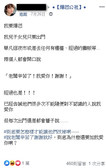 2019年07月29日在這個越來越冷漠的社會,有時候簡單的一句「謝謝」,就足以撫慰人心、為社會增添正能量了!日前就有一位媽媽在網路社團中發文,表示自己的兒子和女兒只要每次出門,無論是逛夜市或者經過任何攤販、櫃檯,兩人都會開口跟對方說「老闆辛苦了!我愛你!謝謝!」對此媽媽非常苦惱,求助網友要如何讓孩子改掉這個習慣,結果網友卻紛紛一面倒的直呼:「不要改!」