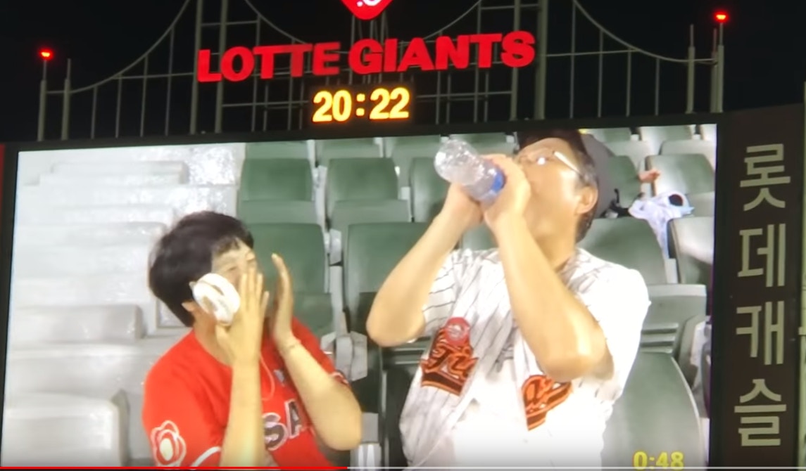 ▼這對中年夫妻都很愛棒球,大叔身穿白色球衣、頭戴棒球帽;妻子則穿著紅色的球衣。妻子發現自己出現在大銀幕上後,驚訝地睜大眼睛、摀住嘴巴;大叔更有戲,他先用雙手遮住嘴巴,接著拿起水瓶灌了一大口水,開始「漱口」。