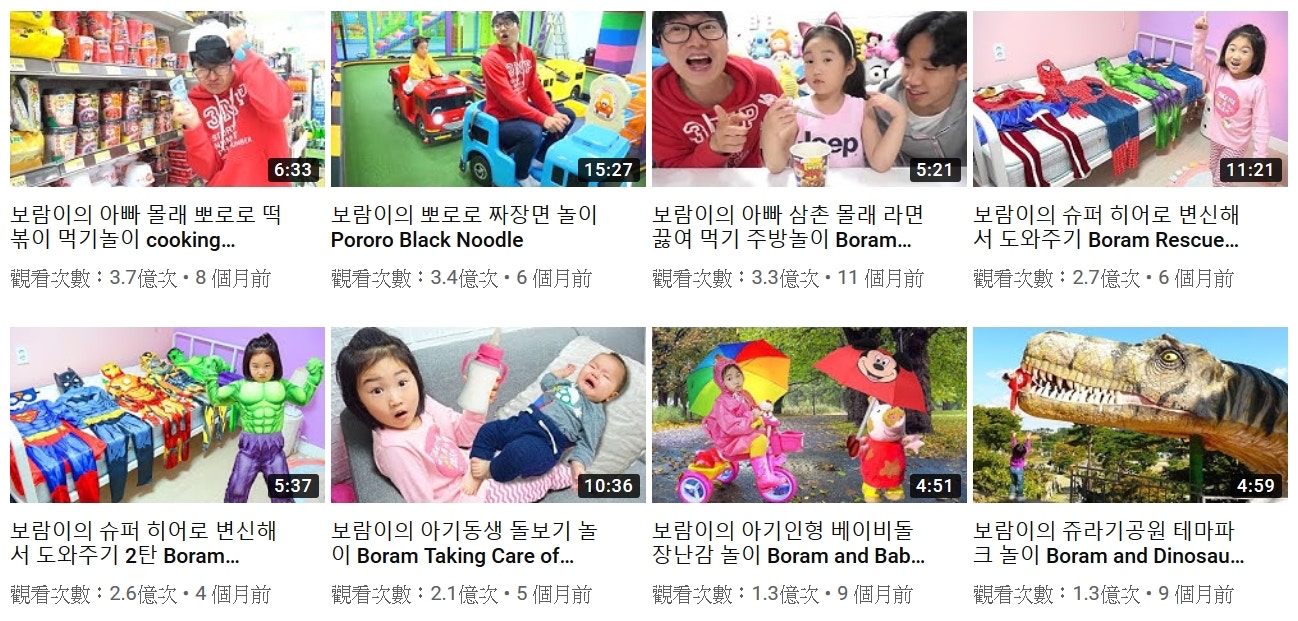 ▼寶藍在YouTube上有2個頻道,第一個是記錄一家人生活點滴的「Boram Tube Vlog」;另一個是寶藍開箱玩具的「Boram Tube ToyReview」。這兩個頻道加起來的訂閱超過3000萬,不管哪個頻道中,都有不少點閱量超過千萬的影片。