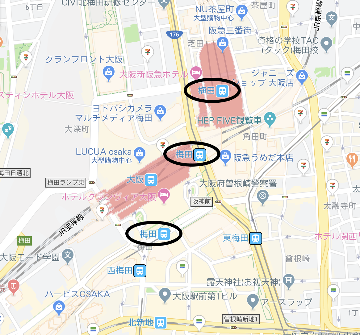 ▼此外,JR、地下鐵四橋線、谷町線還各有北梅田、西梅田、東梅田等站,複雜的動線有些人即便移居大阪多年也搞不清楚,就連土生土長的當地人在約見面時也常常會有「哪個梅田站?」的問題。更有不少網友表示,第一次到大阪的時候真的搞不懂為何同一站的JR線名叫大阪站,地下鐵卻叫做梅田站。
