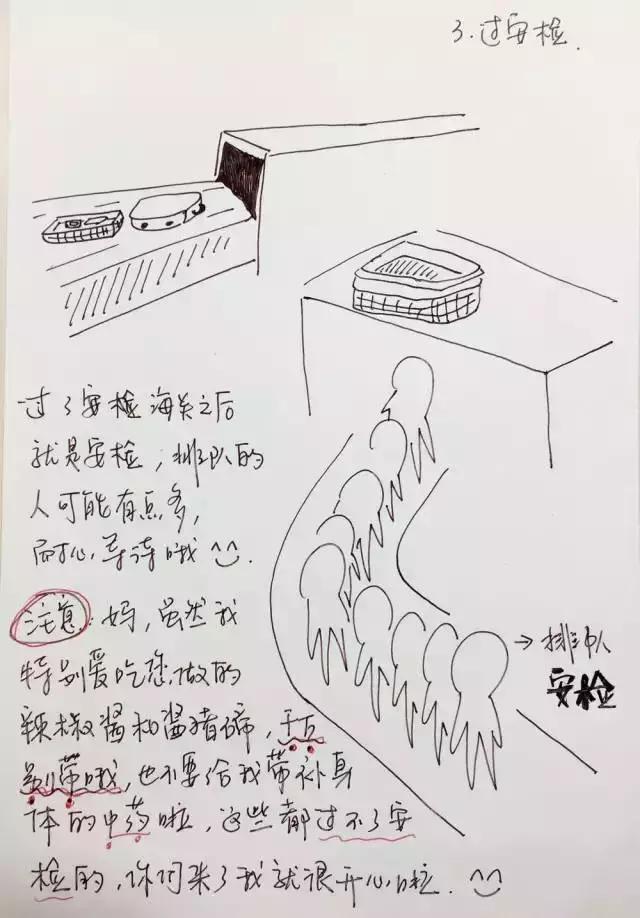 這份流程圖文並茂,細緻入微,不僅有詳細的流程,還有很多注意事項。那名女兒還叮囑媽媽不要帶辣椒醬、醬豬蹄、中藥,雖然她很喜歡吃,但這些過不了安檢,只要父母能來她就很開心了。網友們看到這份手繪流程後紛紛表示被感動,女兒把每個細節都想到了,父母一路一定會順順利利。