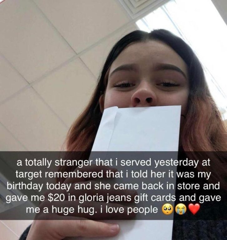 ▼「我偶然和一個陌生人說起,今天是我的生日。她竟然回店裡給了我一張裝有20美元的生日卡,還給了我一個擁抱!」