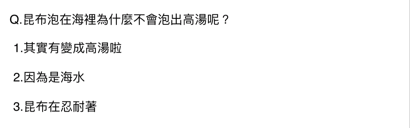▼小樽水族館中給出的解答讓人意想不到,答案竟然是3.「昆布在忍耐」,到底是在忍什麼啦XD。