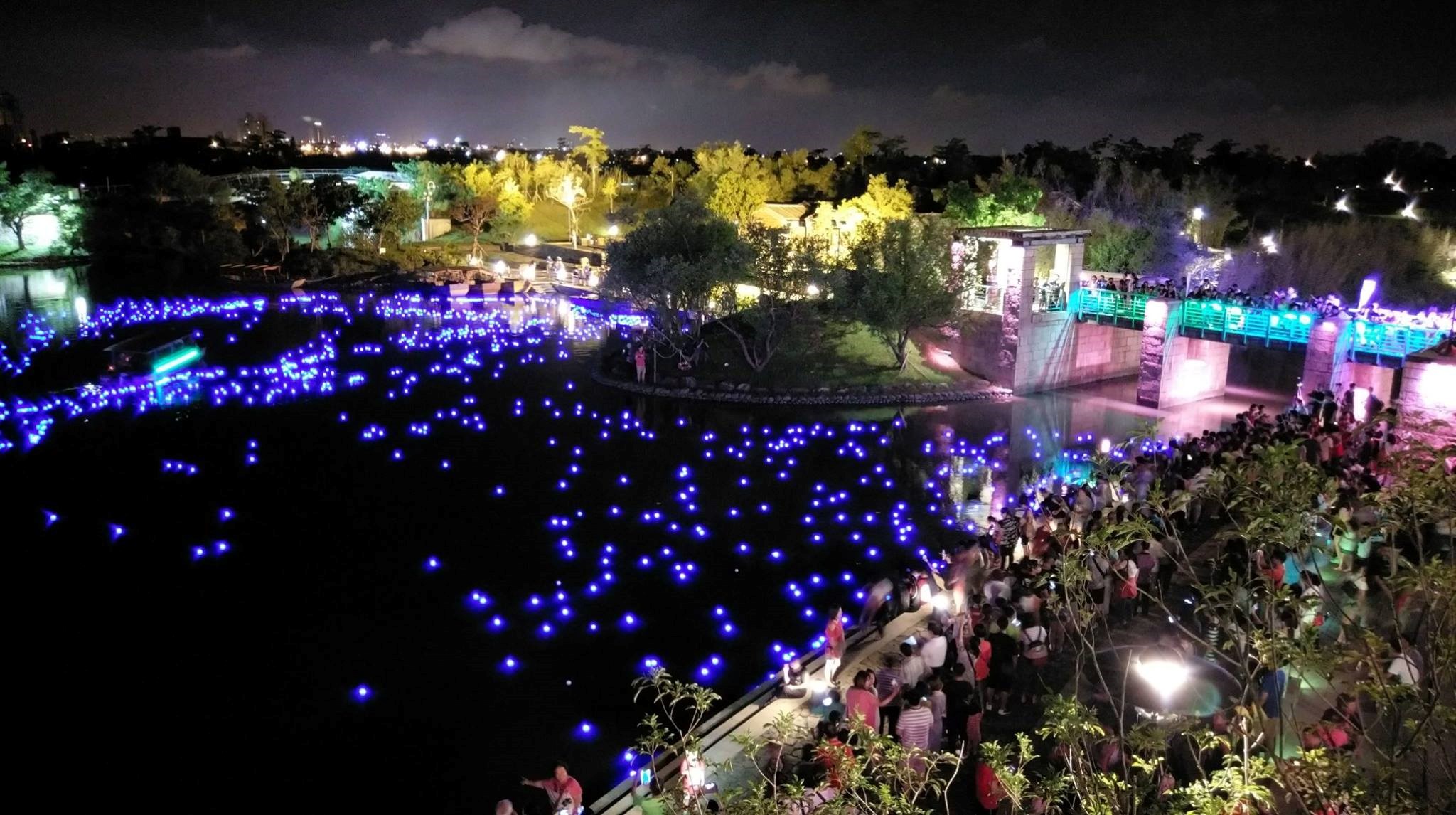 ▼除了浪漫的藍光河道之外,還有超夢幻的「魚耀隧道」以及「希望樹」燈光藝術裝置。全長有65公尺的魚耀隧道,在湖面的倒映下形成完整的一條魚,燈光變換出五顏六色的色彩,非常美麗~