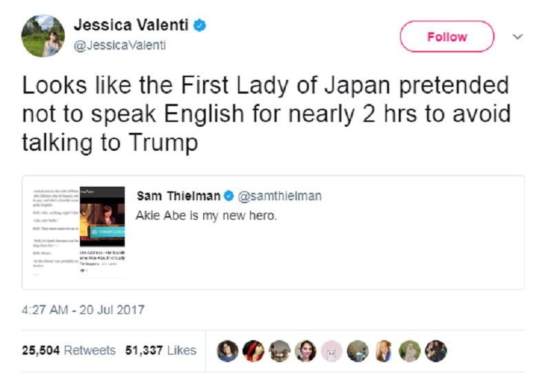 雖然也有人認為安倍昭惠講英文是照著稿子唸,但是發音一點也不差,不可能連一句話也說不出口吧?不管怎樣,真相也只有安倍昭惠才知道。不過,大家很願意相信川普真的很惹人嫌就是了。