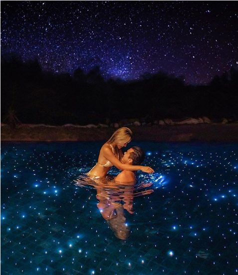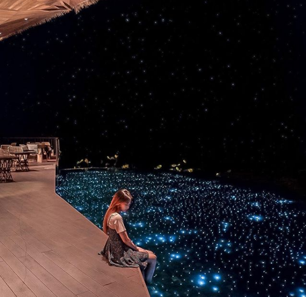 ▼度假村中最具人氣的就是夜晚絕美的星空泳池,池底的燈光猶如繁星點點,和唯美的星空相互映襯,超浪漫!