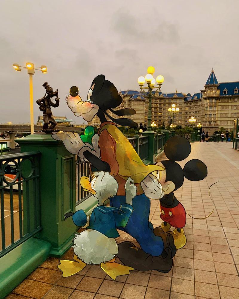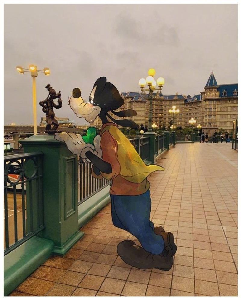 ▼高飛站在迪士尼樂園橋上看自己的雕像。