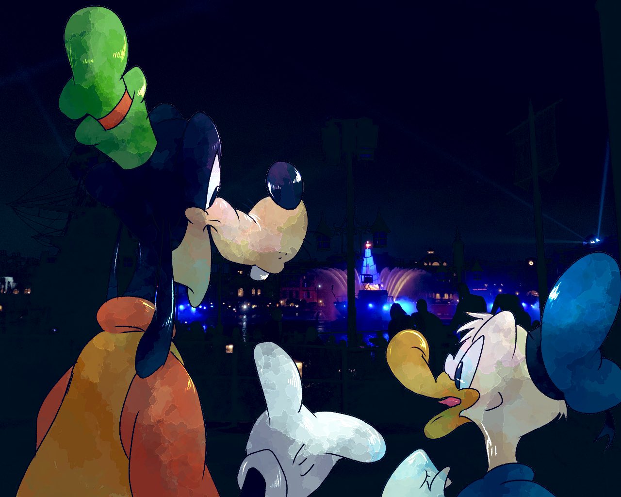 ▼高飛和唐老鴨一起觀看迪士尼樂園裡的奇幻表演。