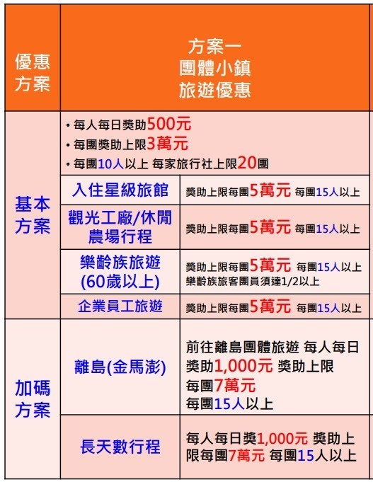 ▼「方案一:團體旅遊優惠」民眾只要參加旅行社團體小鎮旅遊,於台灣本島、離島(金馬澎)、長天數旅遊、入住星級旅館、參觀觀光工廠或休閒農場、60以上樂齡族或企業員工旅遊等,每人每日獎助500元或1000元!