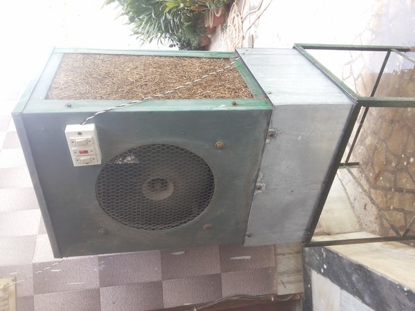 ▼這種稻草冷氣機由水泵、稻草、水箱和風扇組成,冷氣機三面由稻草填充,底部是一個裝水的容器,水泵把底部的水輸送上去澆濕稻草,風扇將稻草上的濕水汽吹出來,利用蒸發冷卻原理,達到降低室溫的效果,據說可以降溫10度。