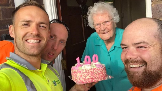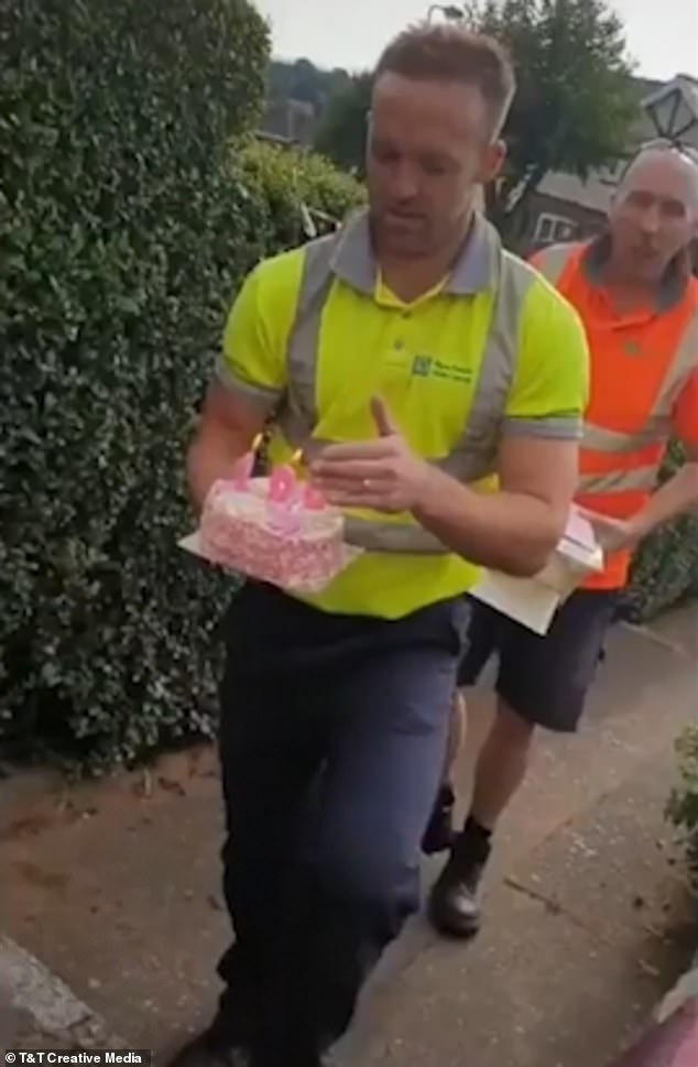 ▼原來當地的資源回收工作人員在她生日當天,為他們最喜歡的這位「好客戶」準備了一個驚喜!他們捧著蛋糕,來到了 Mercy 家門口按門鈴,並且耐心的等待她開門。