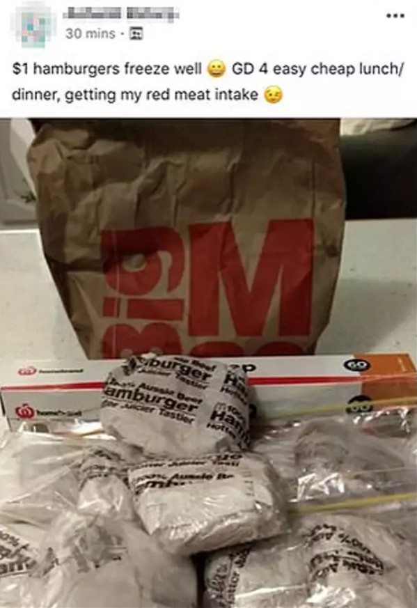 ▼根據媒體報導,其實之前也有一個女網友在網路上分享過這個方法,表示「1元漢堡冷凍得好,用來當成簡單的午餐、晚餐都很不錯,而且裡面還有肉」,卻被網友批評她「給家人吃垃圾食物」、「用這些錢來買些水果吧」;然而也有網友站在女網友的那一邊,表示「如今水果的價格已經超過澳幣1元了,還比漢堡賣得更貴!」