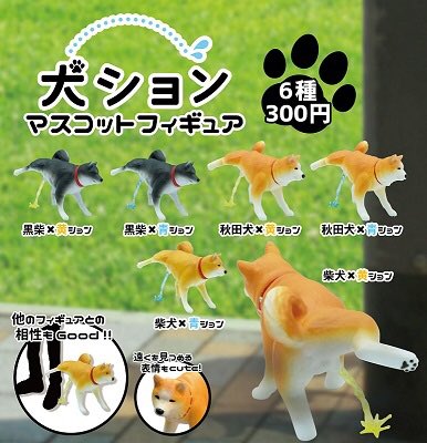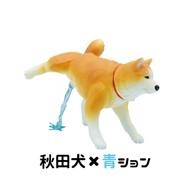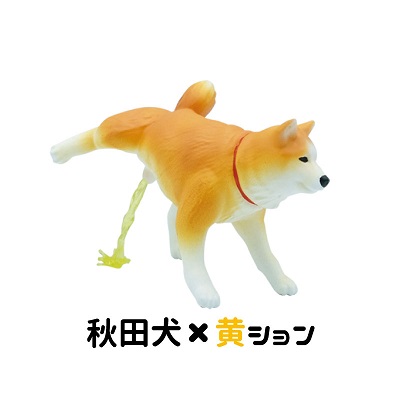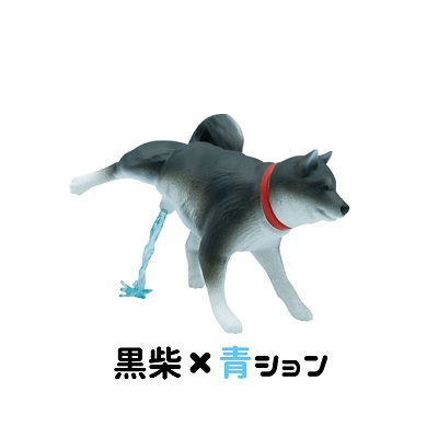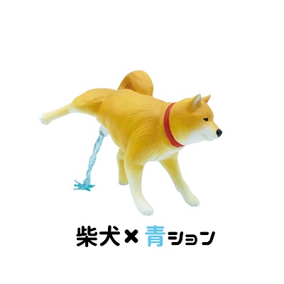 ▼扭蛋共分為6款,分別是黃色柴犬、黑柴犬和跟柴犬相差無幾的秋田犬。尿尿顏色分為黃色和藍色,硬要說的話其實相差不大,大概扭到哪款都不會失望吧…(一般正常狗狗尿尿是藍色的話可以要立刻就醫喔!)