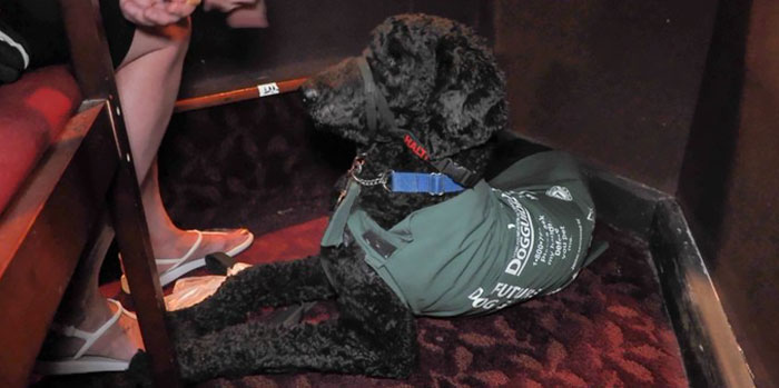 ▼有35年訓犬經驗的訓練員Laura MacKenzie說,平時帶服務犬去劇院時,狗狗應該待在座位底下,或趴在主人腳邊,陪主人一起欣賞。牠們必須適應環境,專注於自己的任務,不能被其他人、其他事影響。