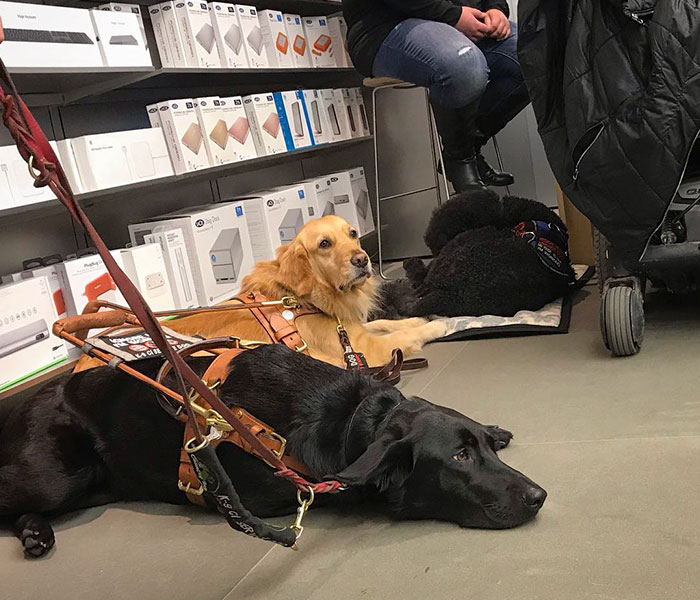 ▼服務犬的訓練項目多種多樣,牠們不僅要陪主人聽音樂劇,還可能陪主人去公園、搭乘公共交通工具。訓練員要帶狗狗熟悉所有的環境,等在任何情況下都能鎮定自若,牠們才算真正合格的服務犬。