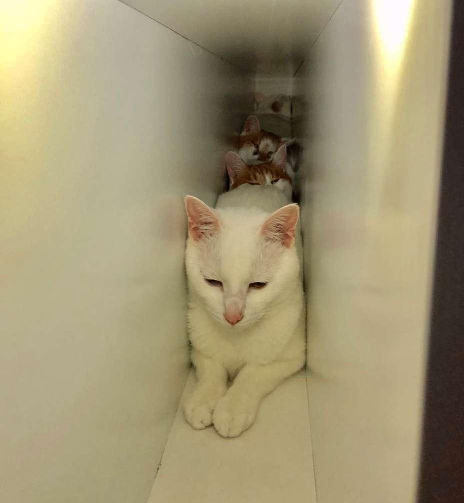 ▼這⋯貓咪都呼吸得到嗎?尤其是被擠到後面去的小貓,看牠的模樣好像很後悔?