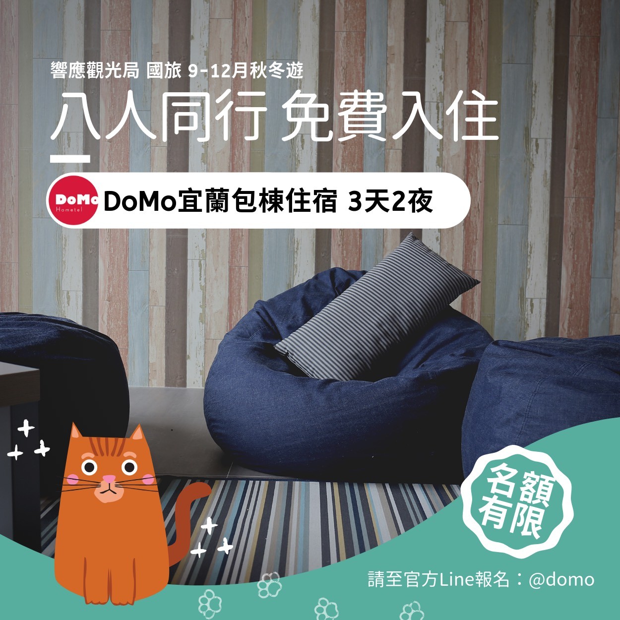 ▼為了響應觀光局的活動方案,DOMO 集團在完成登記觀光局開放系統給旅宿業者參加的秋冬遊補助方案後,隨即宣佈將開放9月1日至12月31日為止,8位旅客以上在週日至週五期間,入住宜蘭 DOMO 民宿3天2夜就能享有房價全免的優惠!