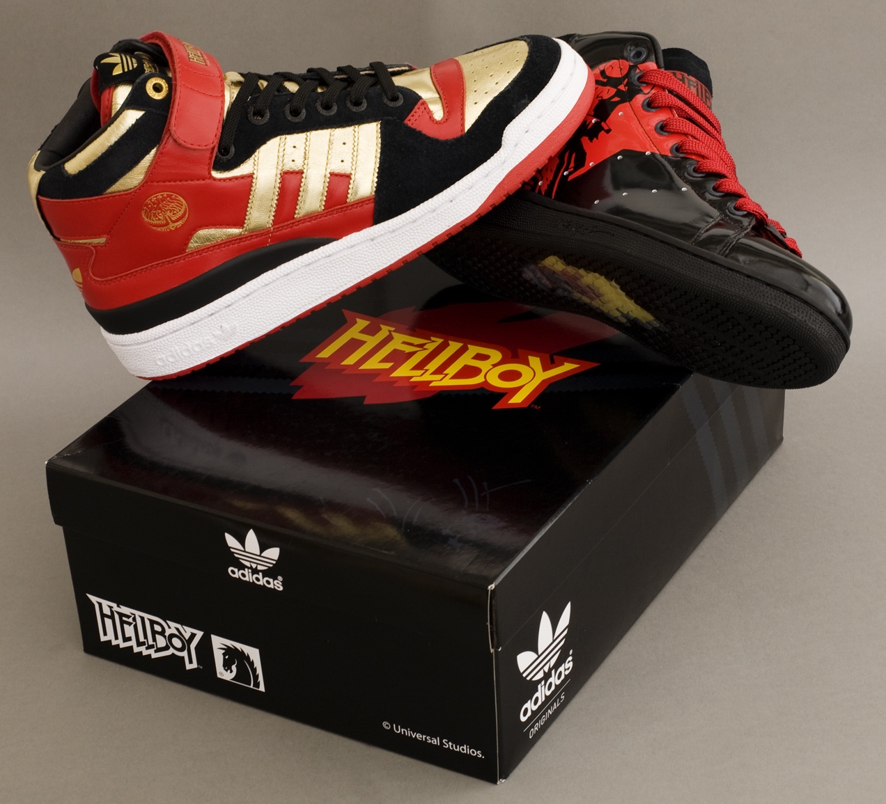 ▼6.地獄怪客:2008年時,adidas Originals推出了adidas Forum Mid ‘Golden Army’鞋款。這雙鞋子的材質很特別,是紅色、金色漆皮搭配黑色麂皮。鞋子側面還有醒目的標誌。這是電影導演Guillermo Del Toro親自參與設計的限量鞋款,很有誠意。