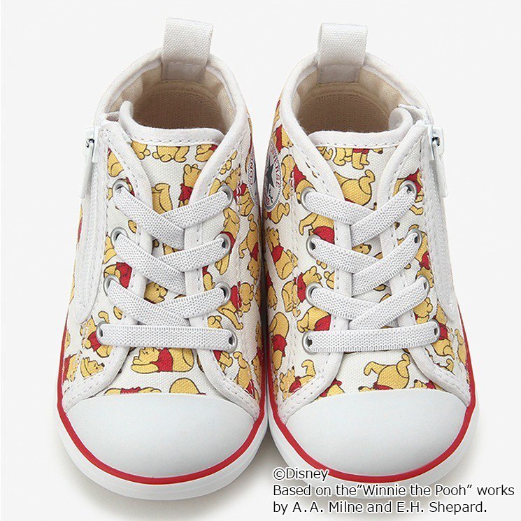 ▼首先來看看為「大小孩」設計的帆布鞋(日碼15-22cm)。這款「CHILD ALL STAR N POOH PT Z HI」採用All Star帆布鞋中經典的配色,白底+紅色線條,非常百搭。