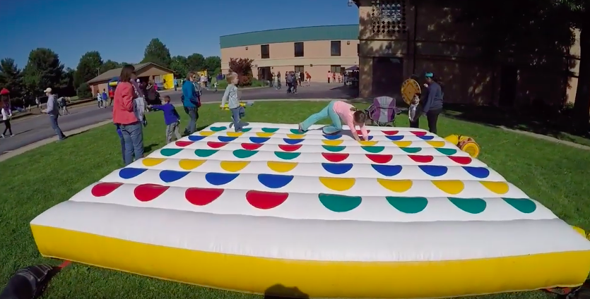 ▼這一款扭扭樂包括一個充氣墊、一個轉盤,還有一個用來充氣的吹風機。充氣墊充飽氣完全展開後,尺寸為4.5公尺x4.5公尺,可以承受680公斤的重量。