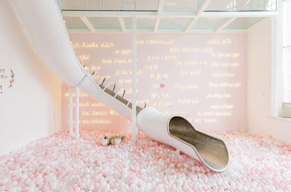▼民宿內的大型溜滑梯從2樓延伸到1樓,底部是粉色和白色球海洋,讓人彷彿置身夢幻樂園。背後「我愛你」網紅牆,隨手一拍就是奇蹟美照。
