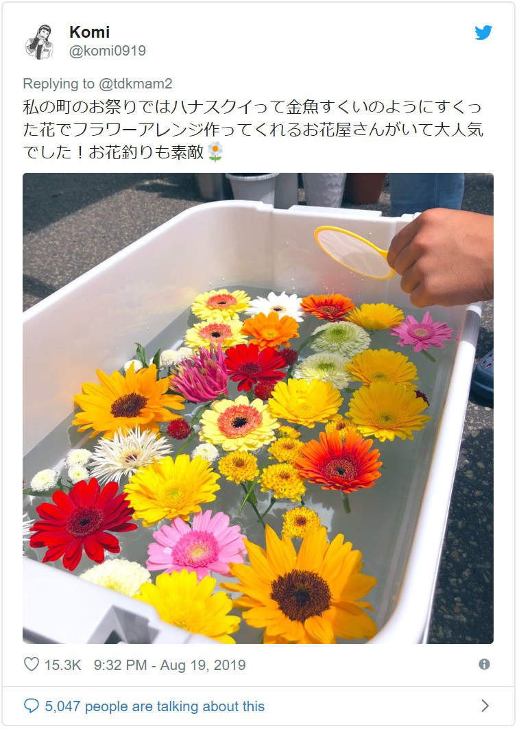 2019年08月26日大家玩過撈金魚、套圈圈之類的遊戲嗎?這些夜市裡常見的遊戲,在日本的傳統祭典中也能看到。但很多人玩遊戲前,根本沒想過如何處置金魚,所以這種傳統遊戲一直存在爭議。現在攤位遊戲悄悄出現了變化,商家用一朵朵鮮花代替金魚,這在網路上引發話題。