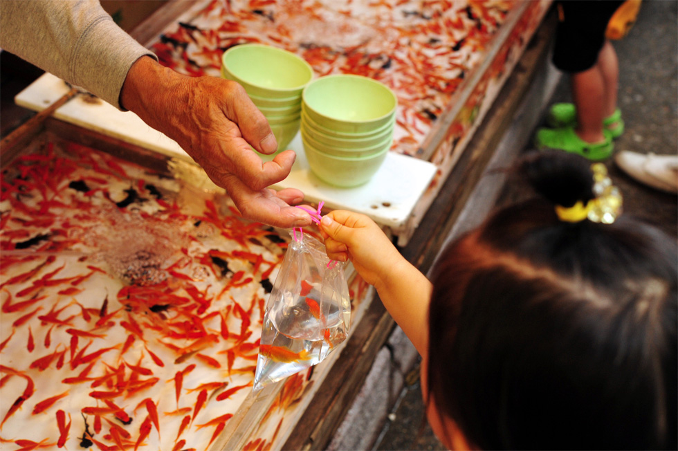 ▼撈金魚這種遊戲在日本傳統祭典中很常見。很多小朋友都會央求爸爸媽媽帶自己去撈金魚,但小金魚變成玩物,真的不是一件好事。