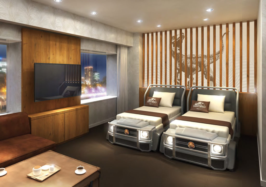 ▼4.侏羅紀世界冒險(Jurassic World Adventure):電影《侏羅紀世界》中可愛與可怕參半的迅猛龍盯著你入睡。床鋪做成侏羅紀公園中的導覽車型,無論大男孩還是小男孩住進來都會超興奮!