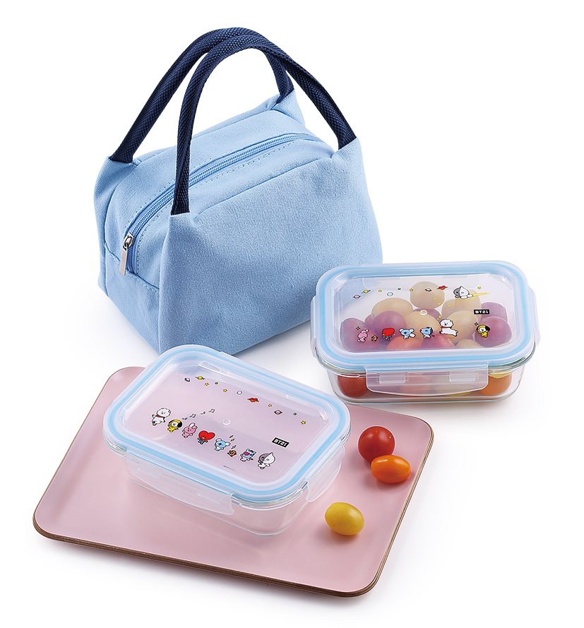 ▼「BT21玻璃保鮮盒650ml兩件組附提袋,上蓋有黏貼BT20成員圖樣,可耐溫-20-400度,盒身可使用於微波與烤箱,超值價399元/組。