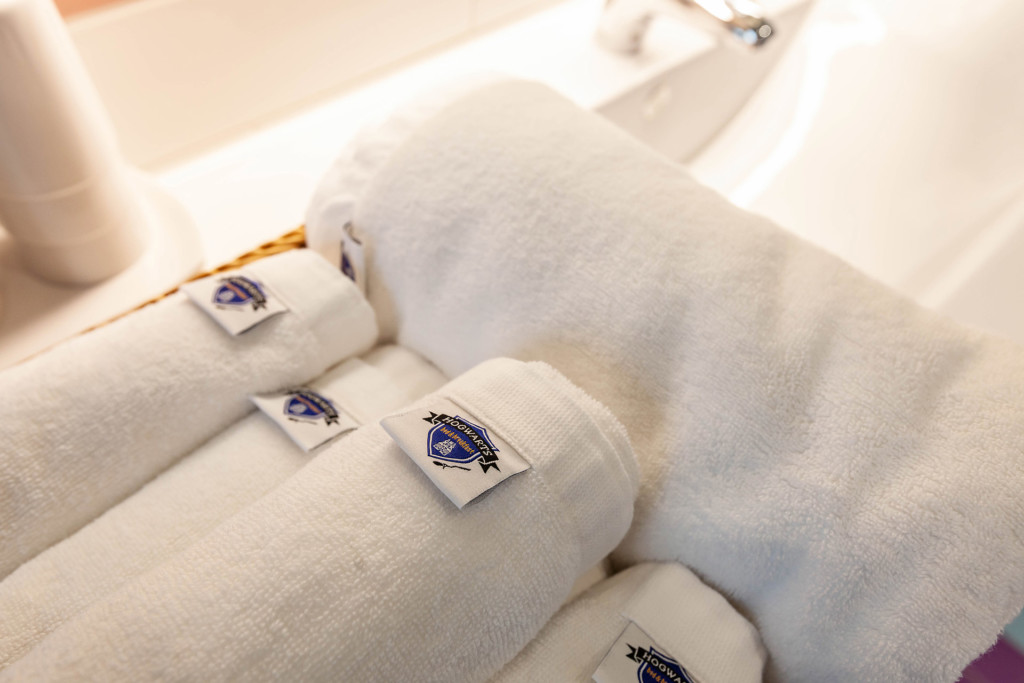▼就連浴室也是古堡風、毛巾上還繡著「霍格華茲」,來這裡住真的都不會出戲XD。