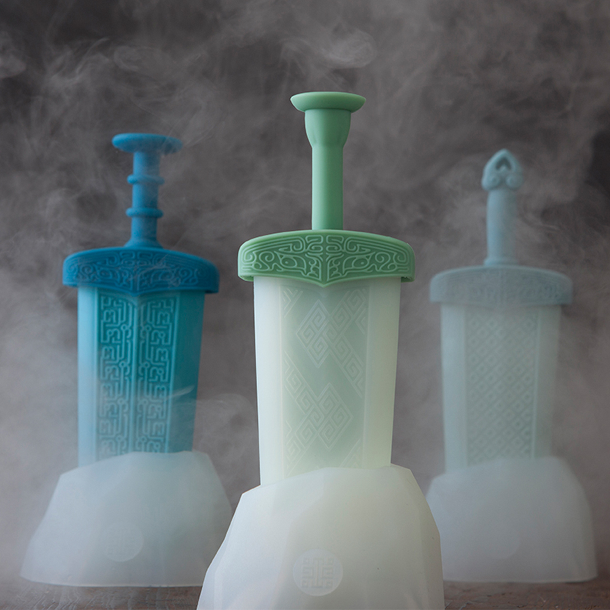 ▼故宮推出的劍形製冰器一共有3種造型,分別是越王劍、奇字劍與無首劍。每一柄劍都附有冰山立座,將冰劍拔出來的一剎很有儀式感。