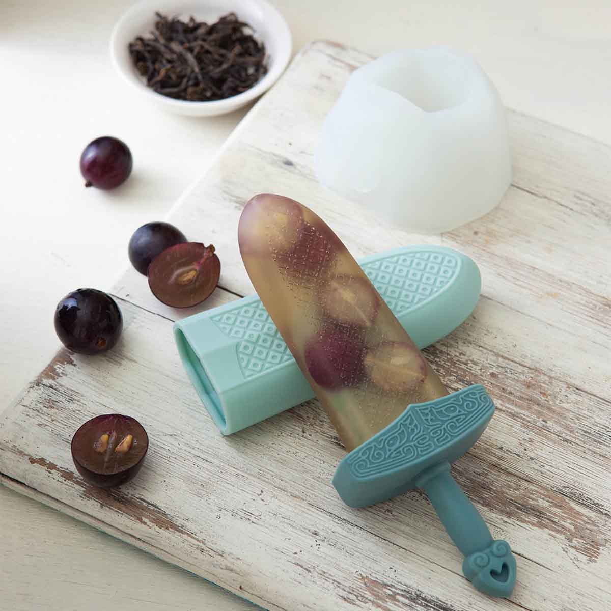 ▼劍形製冰器是用環保矽膠製成的,可耐零下40度的低溫,還有240度的高溫。劍鞘上有精緻的紋路,會印在冰棒上,讓冰棒看起來更精緻。