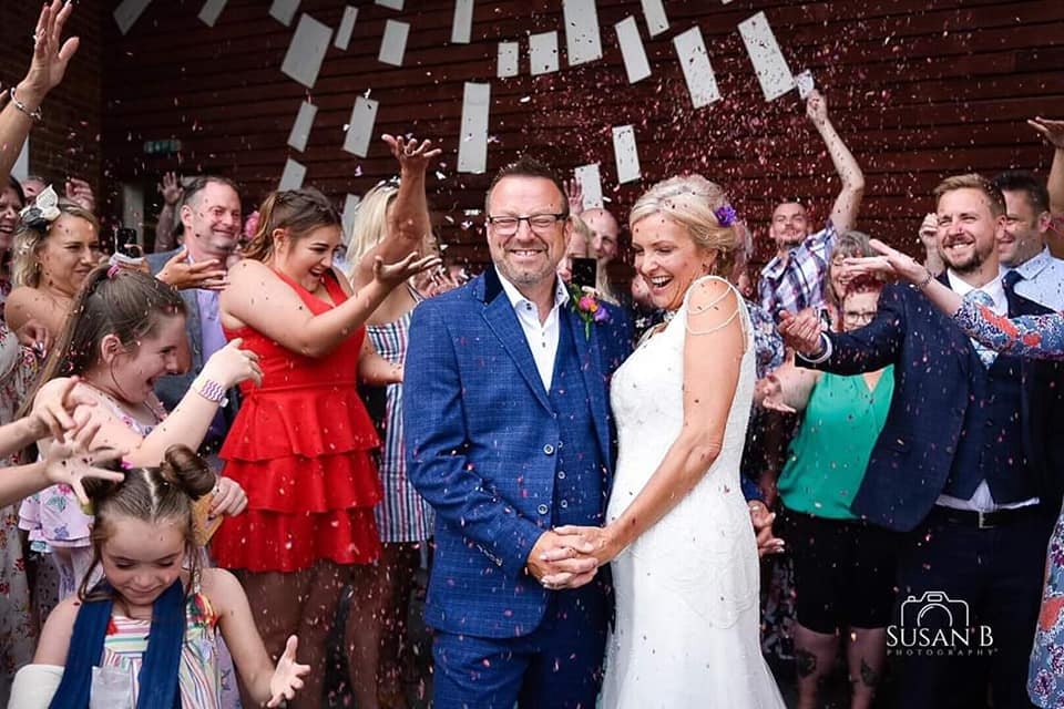 ▼Dawn和Steve的想法很合拍,他們共同策劃了一場環保婚禮。婚禮上沒有任何塑膠製品,用乾玫瑰花瓣代替五彩紙屑、手工製作彩旗、不用紙花或塑膠花。Dawn說:「我們想在保護地球的前提下找樂子。」