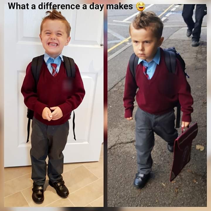▼這巨大的反差讓網友們忍不住哈哈大笑,很多家長po出自家小孩第一天上學時的照片,原來孩子們都是這樣過來的啊。