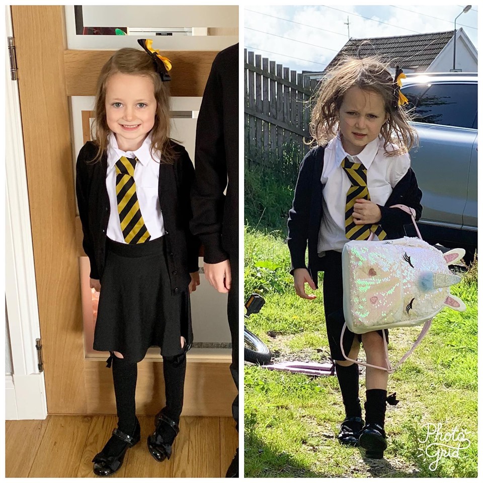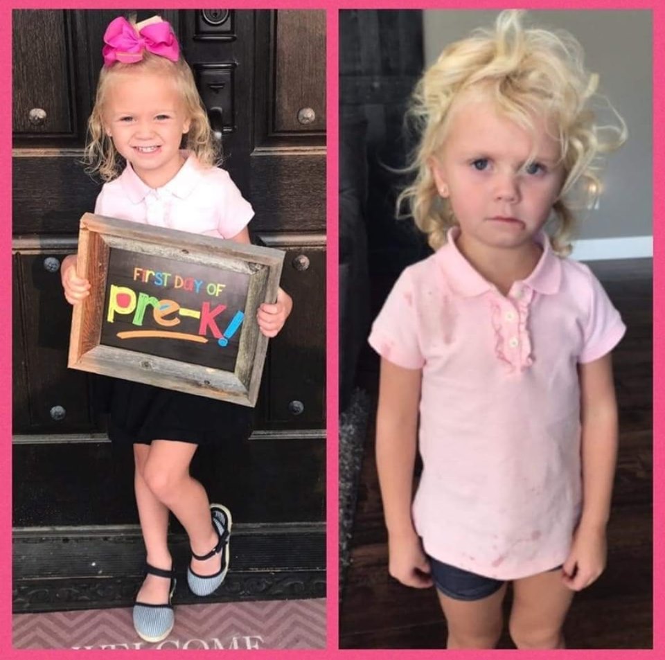 2019年08月28日上學的第一天,對小孩和家長來說都很值得紀念。住在紐西蘭的一位媽媽在臉書分享了女兒Lucie上學第一天的照片。去學校時她是個可愛乖巧、一臉甜笑的小公主;放學回來後竟然變成了披頭散髮的「小太妹」!