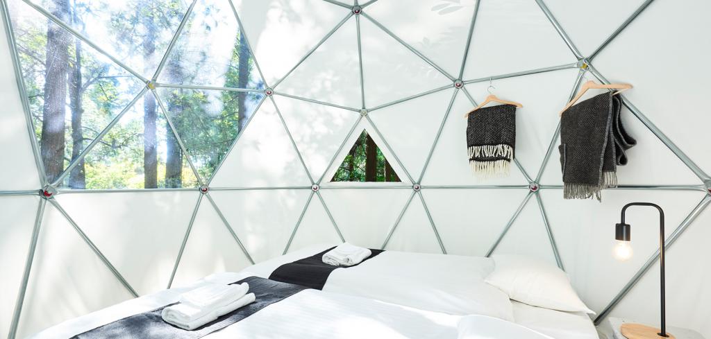 ▼第二種是架設於木平台上的球形帳篷,帳篷就放置在幽靜的樹林中,從天窗可以欣賞森林景色。