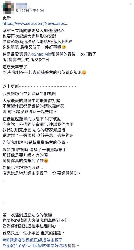 ▼原來這名網友的舅舅提早離開大家,而生前的他非常喜歡說「輸的請吃茹絲葵」,只是一直都無法如願,他們也沒機會親自帶舅舅吃一次他心繫的牛排館。