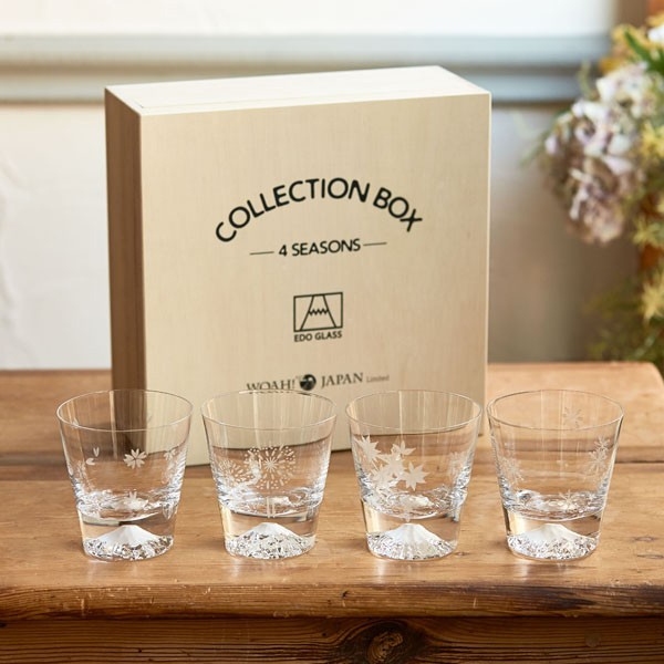 ▼江戶硝子也推出了許多限定版的富士山酒杯,比如四季主題,代表著春天的杯身雕刻有飄落的櫻花瓣,夏天是絢爛的煙火,秋日是熱烈的楓葉,冬日是飄揚的雪花。
