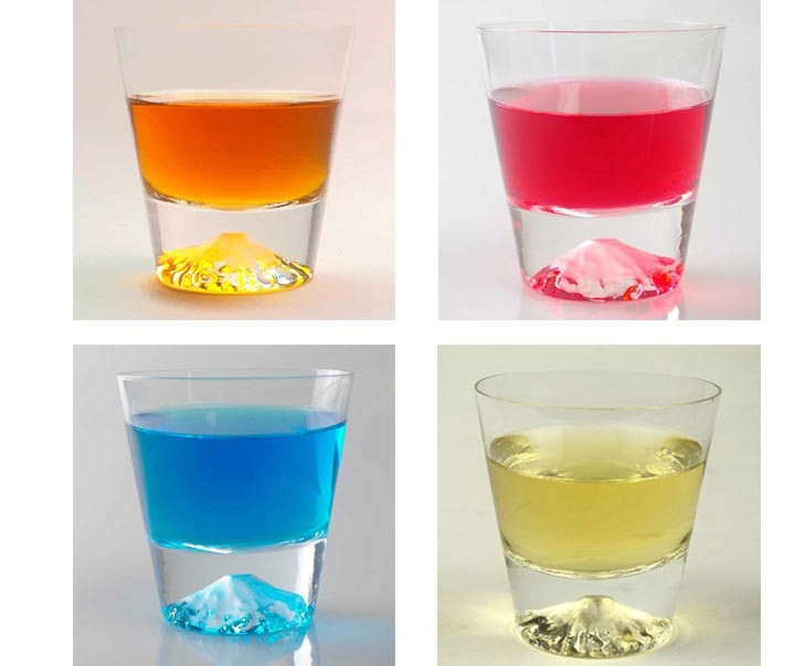 ▼更厲害的是,杯內倒入飲料後會隨著光折射,將顏色映在杯底的富士山。倒入不同顏色的飲料,杯底的富士山就會呈現出不同的顏色,令人拍案叫絕。